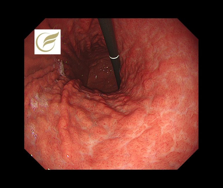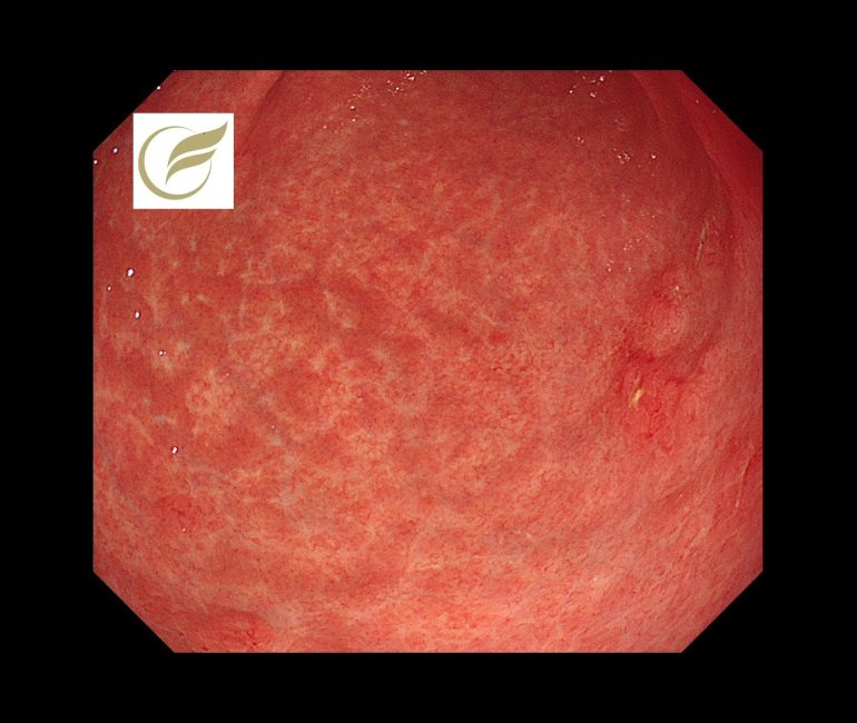 内視鏡的には、胃全体の発赤、浮腫、顆粒状変化、白苔付着などを示し(3)(4)、明らかな潰瘍や隆起を欠きH. pylori関連慢性胃炎との鑑別が困難な場合があります(2)(3)。